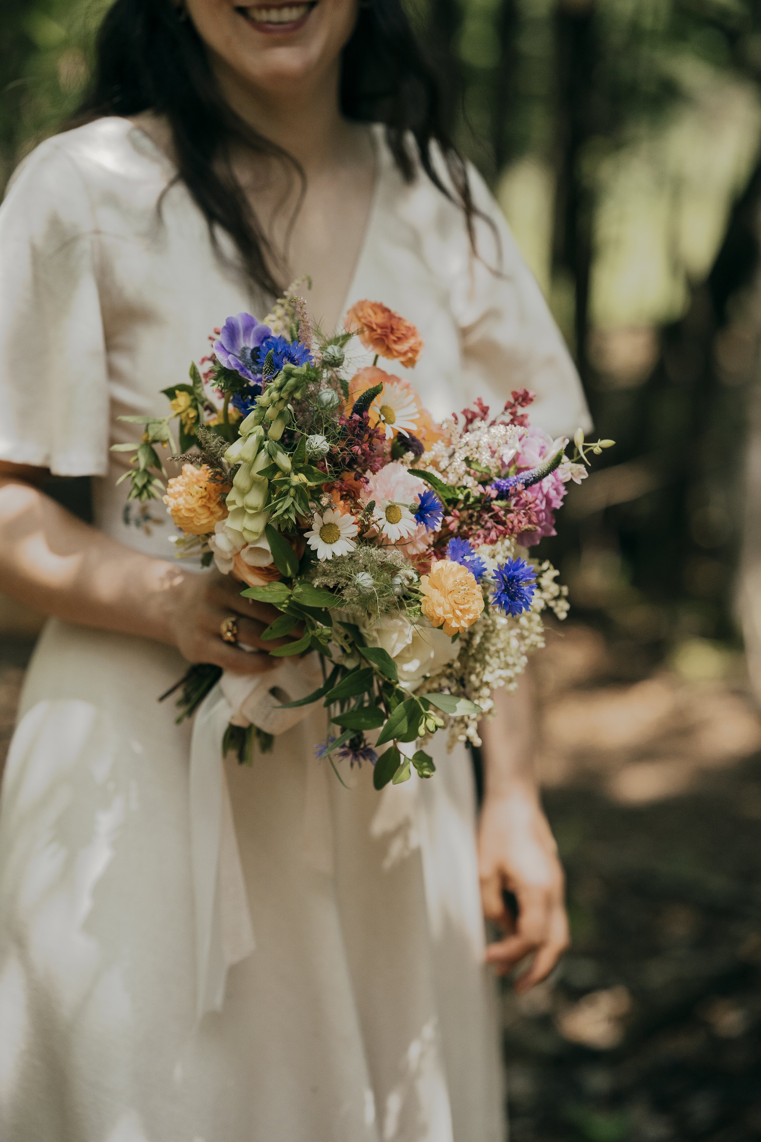 Donna in abito da sposa con corona di fiori gialli, che tiene un grande bouquet di fiori gialli, in una stanza ben illuminata con pareti di mattoni a vista.